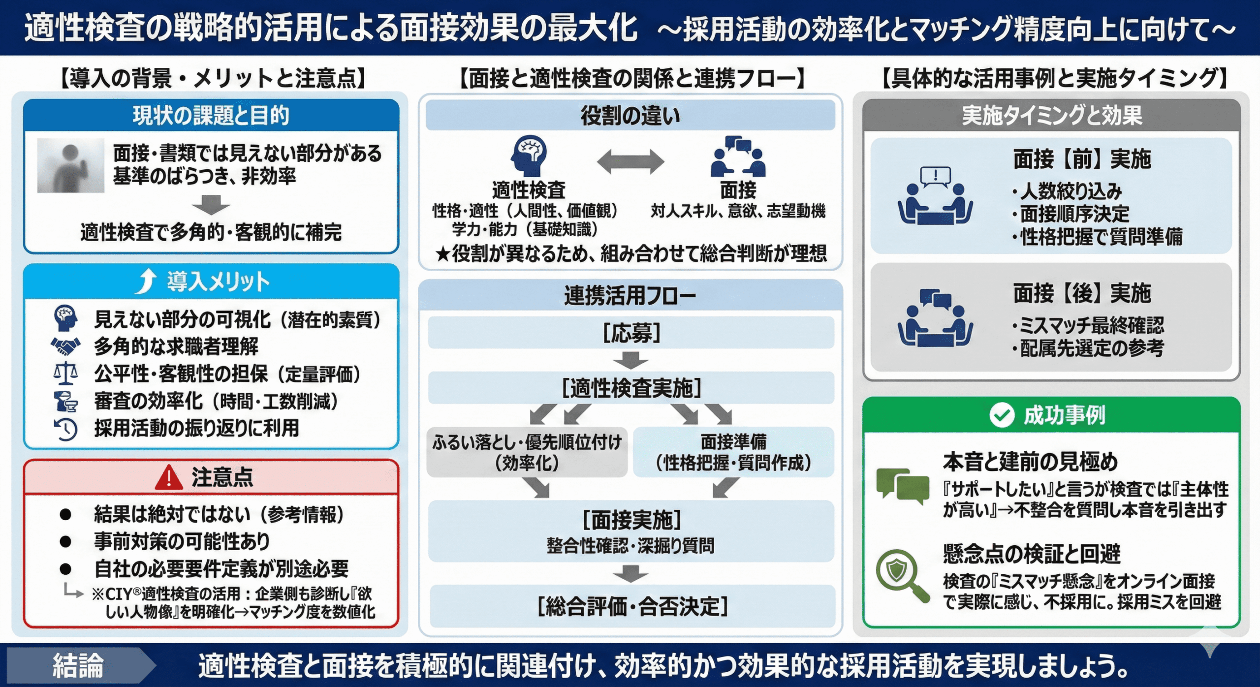 適性検査と面接をうまく併用すれば、求職者の能力や性格を立体的に把握することができ、採用の成功につながることが期待できます。