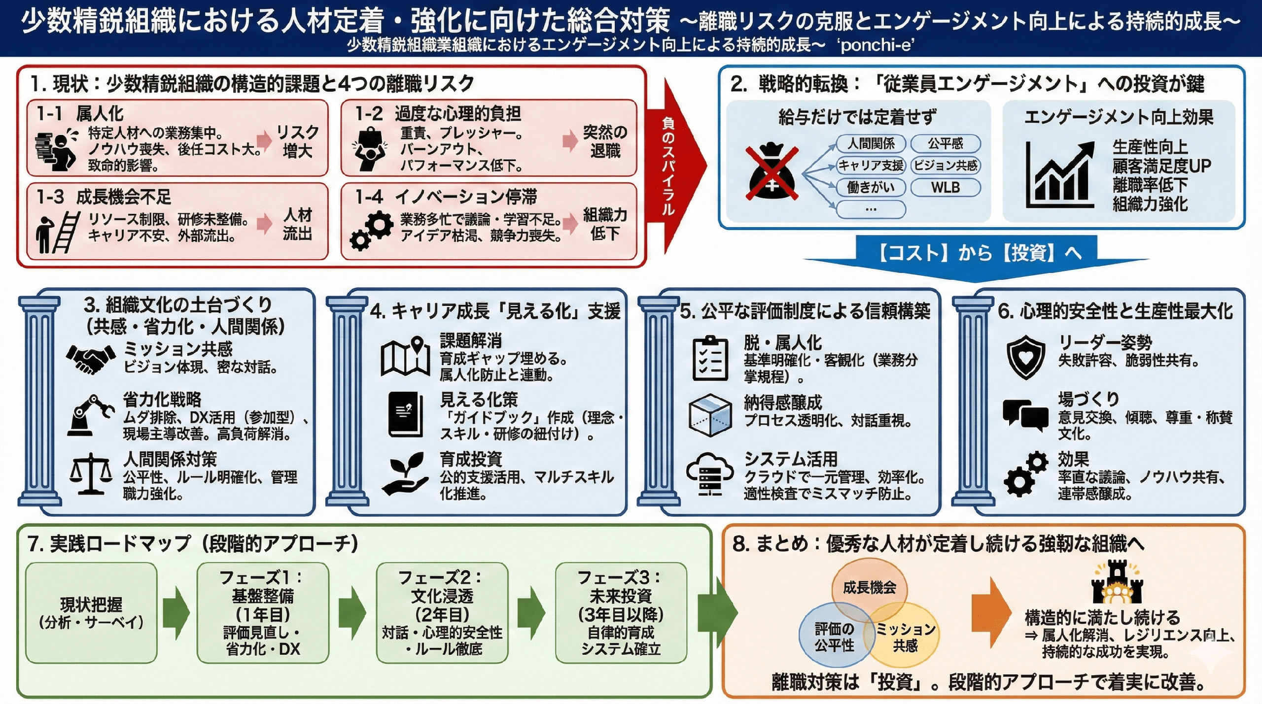 これらの施策を段階的に実行することで、少数精鋭企業は優秀な人材が安心して長期間活躍し、組織の成長を牽引する強靭な体制を構築できます。