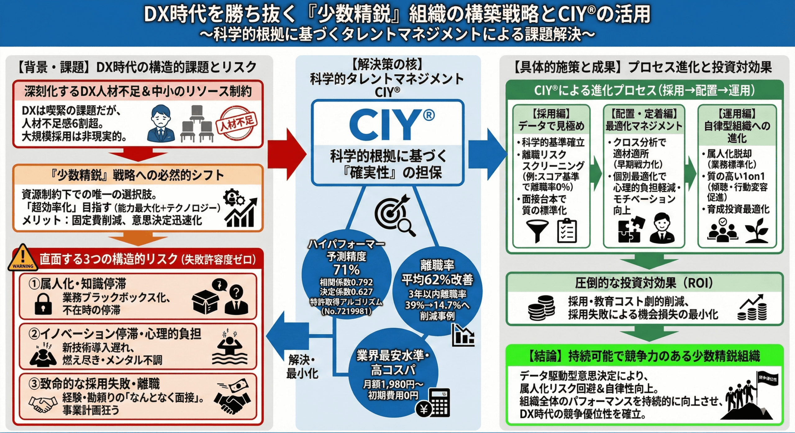 本記事では、ハイパフォーマー予測精度71%、離職率平均62%改善という実績を持つタレントマネジメントプラットフォームCIY®が、どのように少数精鋭チームの「確実性」を科学的に担保し、DX時代を勝ち抜く組織づくりを実現するのかを解説します。