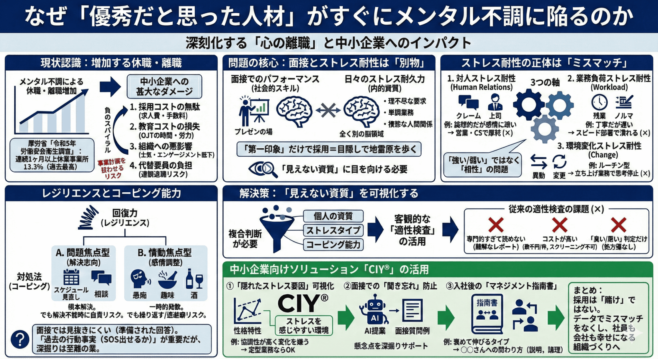 なぜ、採用選考の段階でこのリスクを見抜けなかったのでしょうか。 最大の原因は、「面接でのパフォーマンス」と「日々のストレスに対する耐久力」には相関関係がほとんどないという事実にあります。