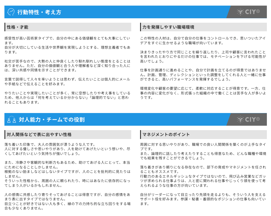 このうち、「個人診断結果(ブルー)」は、受検者の性格・特性の解説と、マネジメントのポイントなどがテキストで表現されています。