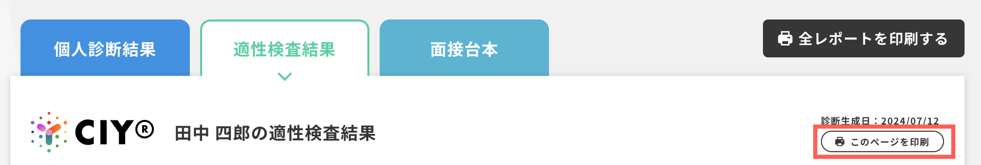 ⚠️右上に表示される「全レポートを印刷する」ボタンをクリックすると、「適性検査結果」「面接台本」を含む、全レポートがPDF保存または印刷されますので、用途に応じて使い分けていただければ幸いです。