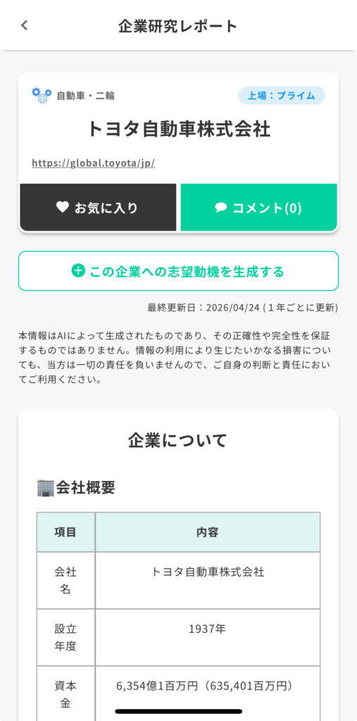 かなり詳細な企業研究レポートが生成されるので、一から自分で企業研究する手間がなくなります。