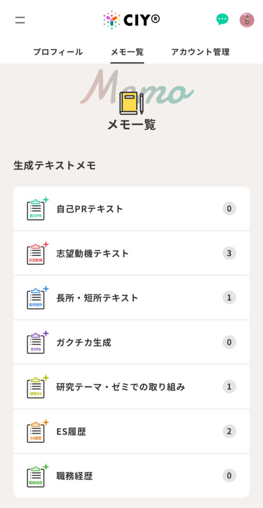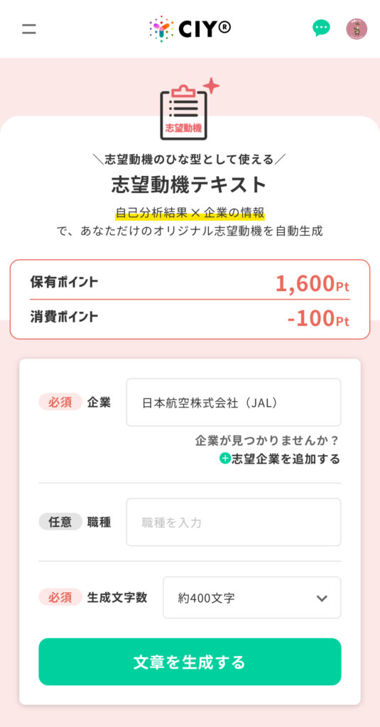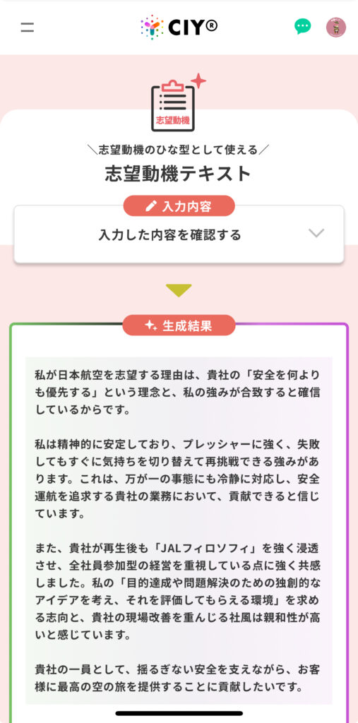 CIY®自己分析をベースに、就活・転職に必要な以下のテキストがすべて自動生成されます。
